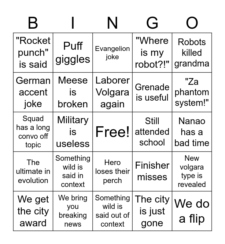 This bingo card has a free space and 24 words: Something wild is said in context, We bring you breaking news, Laborer Volgara again, We get the city award, Robots killed grandma, "Rocket punch" is said, German accent joke, Puff giggles, Still attended school, Hero loses their perch, Grenade is useful, Squad has a long convo off topic, Finisher misses, New volgara type is revealed, Meese is broken, The city is just gone, Nanao has a bad time, Evangelion joke, "Za phantom system!", Military is useless, We do a flip, The ultimate in evolution, "Where is my robot?!" and Something wild is said out of context.
