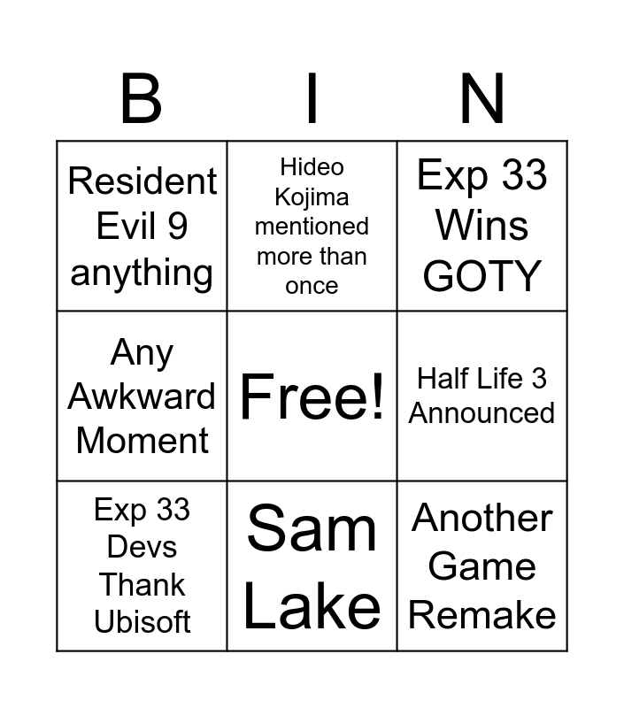 This bingo card has a free space and 8 words: Half Life 3 Announced, Exp 33 Wins GOTY, Hideo Kojima mentioned more than once, Exp 33 Devs Thank Ubisoft, Resident Evil 9 anything, Another Game Remake, Any Awkward Moment and Sam Lake.