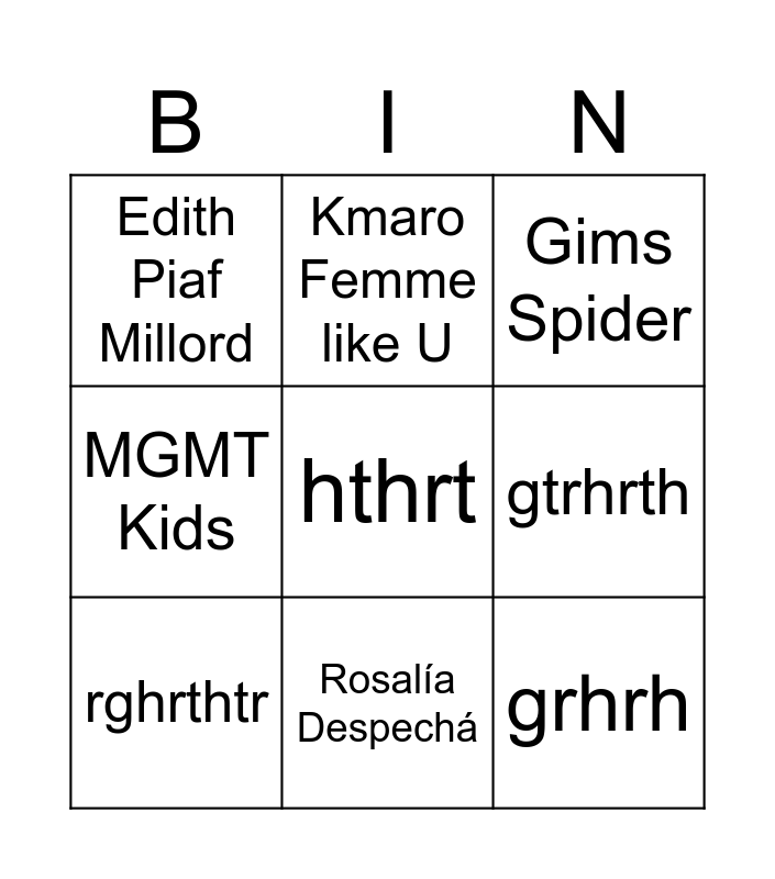 This bingo card has 18 words: Claude François Alexandrie Alexandra, Sean Paul Get Busy, Gims Spider, Edith Piaf Millord, Chic Le Freak, MGMT Kids, Booba N°10, Kmaro Femme like U, Rosalía Despechá, grhrh, rgrth, hthrt, bfthgtr, gtrhrth, rghrthtr, bfhrth, htrhrth and httrht.