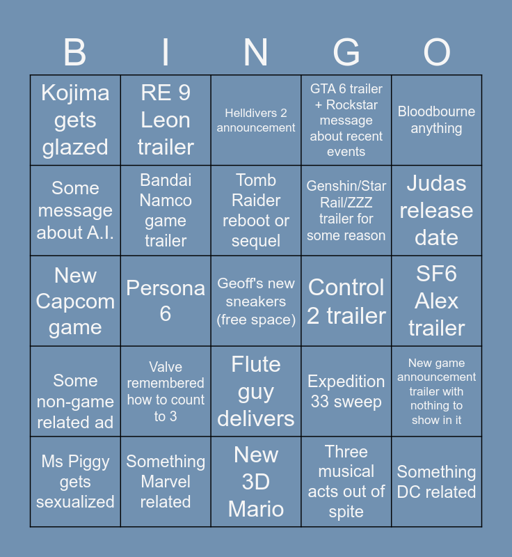 This bingo card has a free space and 24 words: Valve remembered how to count to 3, Something Marvel related, Tomb Raider reboot or sequel, Ms Piggy gets sexualized, Bloodbourne anything, Kojima gets glazed, Some message about A.I., RE 9 Leon trailer, Control 2 trailer, Flute guy delivers, Genshin/Star Rail/ZZZ trailer for some reason, New Capcom game, Expedition 33 sweep, New game announcement trailer with nothing to show in it, Bandai Namco game trailer, Three musical acts out of spite, SF6 Alex trailer, Helldivers 2 announcement, Judas release date, Persona 6, Something DC related, Some non-game related ad, GTA 6 trailer + Rockstar message about recent events and New 3D Mario.