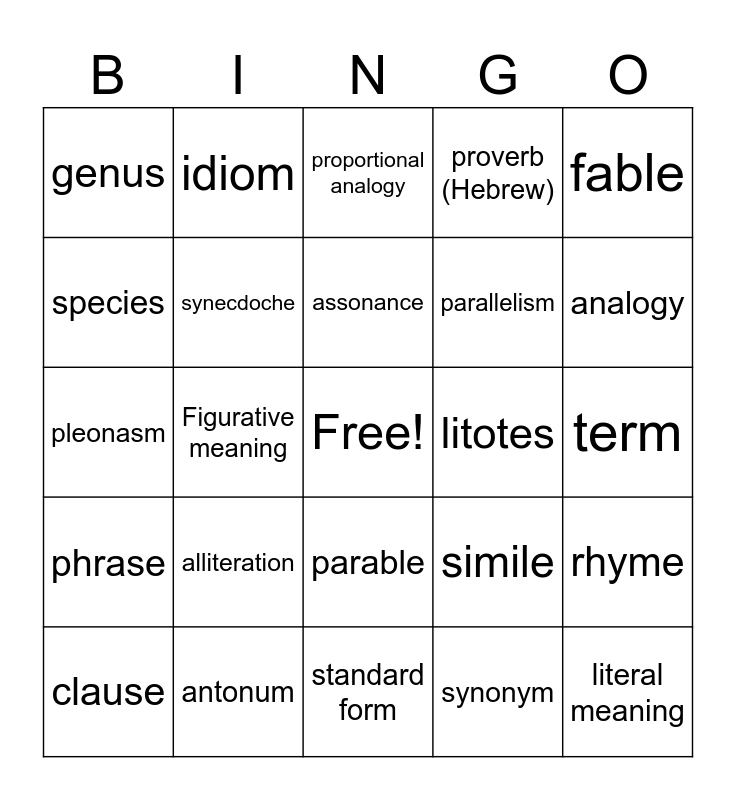This bingo card has a free space and 24 words: alliteration, antonum, assonance, clause, fable, genus, species, idiom, litotes, parable, parallelism, pleonasm, simile, rhyme, synecdoche, synonym, term, proportional analogy, analogy, Figurative meaning, literal meaning, phrase, proverb (Hebrew) and standard form.