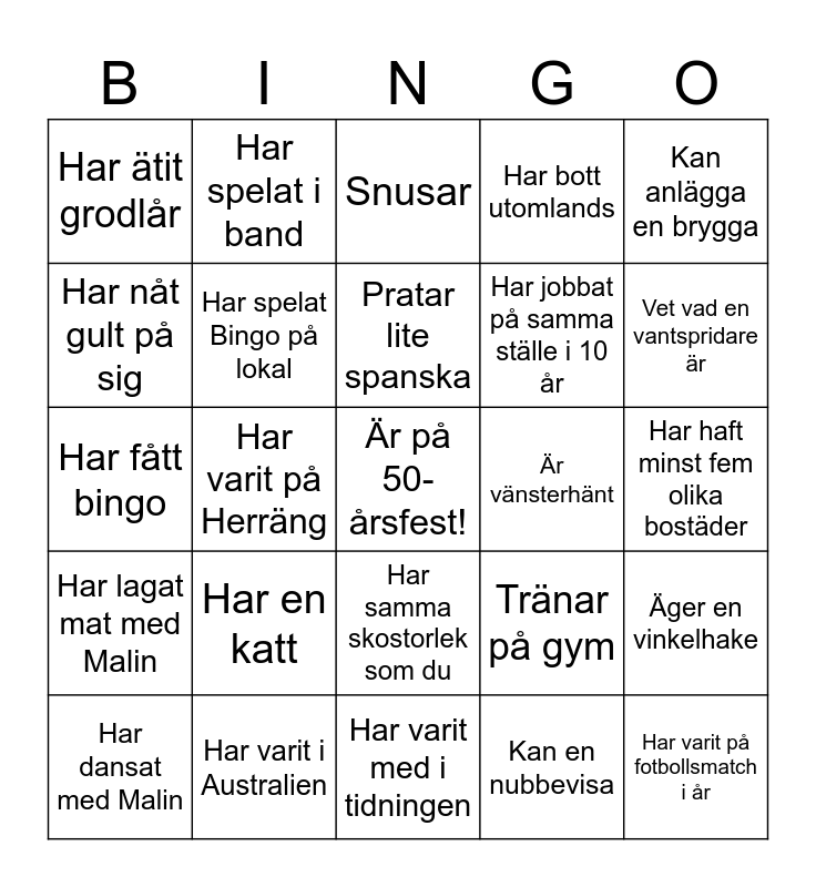 This bingo card has a free space and 24 words: Har en katt, Har varit i Australien, Pratar lite spanska, Har dansat med Malin, Kan anlägga en brygga, Har ätit grodlår, Har nåt gult på sig, Har spelat i band, Är vänsterhänt, Har samma skostorlek som du, Har jobbat på samma ställe i 10 år, Har fått bingo, Tränar på gym, Äger en vinkelhake, Har spelat Bingo på lokal, Kan en nubbevisa, Har haft minst fem olika bostäder, Snusar, Vet vad en vantspridare är, Har varit på Herräng, Har varit på fotbollsmatch i år, Har lagat mat med Malin, Har bott utomlands and Har varit med i tidningen.