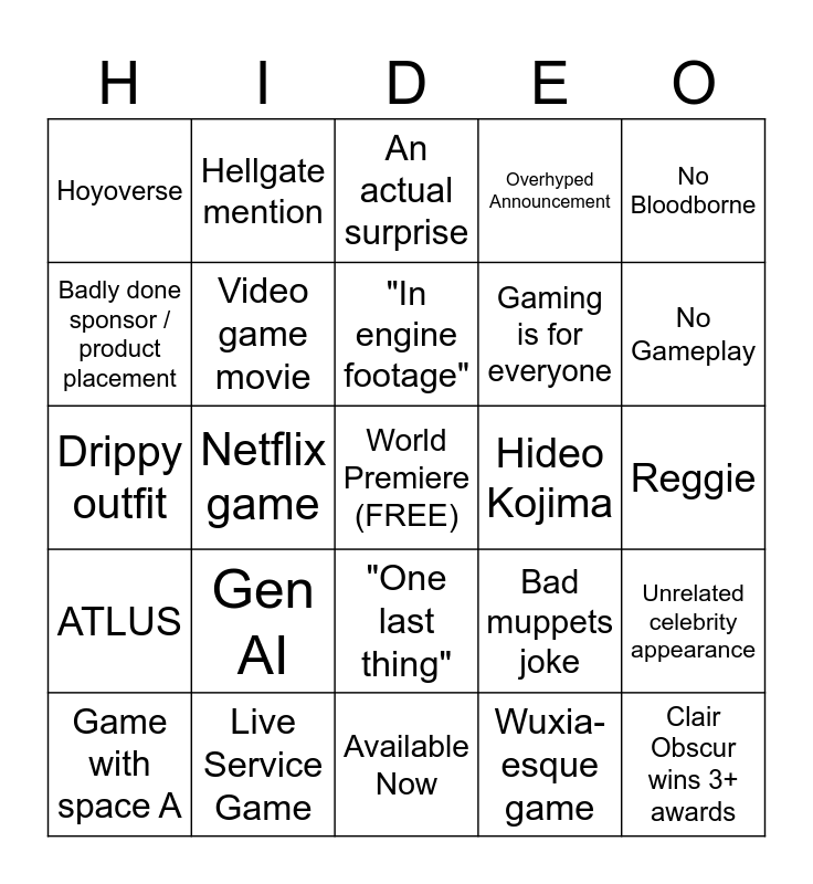 This bingo card has a free space and 24 words: Gen AI, Live Service Game, "In engine footage", Game with space A, No Bloodborne, Hoyoverse, Badly done sponsor / product placement, Hellgate mention, Hideo Kojima, "One last thing", Gaming is for everyone, Drippy outfit, Bad muppets joke, Unrelated celebrity appearance, Video game movie, Wuxia-esque game, Reggie, An actual surprise, No Gameplay, Netflix game, Clair Obscur wins 3+ awards, ATLUS, Overhyped Announcement and Available Now.