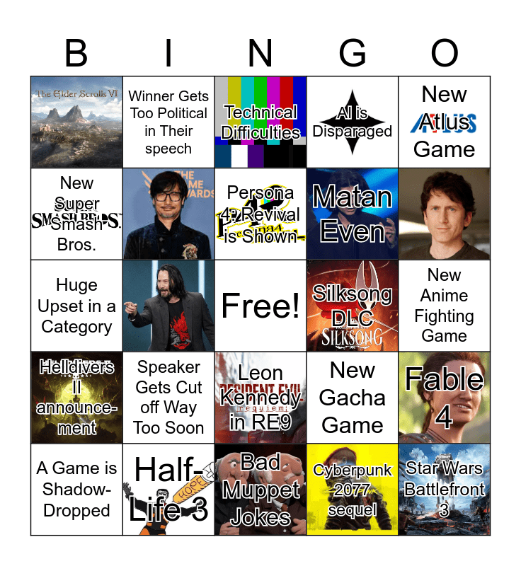 This bingo card has 22 images, a free space and 26 words: Half-Life 3, Monster Hunter Wilds DLC, New Fallout Game, Technical Difficulties, Leon Kennedy in RE9, Silksong DLC, Bad Muppet Jokes, New Anime Fighting Game, Star Wars Battlefront 3, Cyberpunk 2077 sequel, New LotR game, Light No Fire announce-ment, New Gacha Game, Helldivers II announce-ment, Speaker Gets Cut off Way Too Soon, New Atlus Game, Huge Upset in a Category, New Game in a long-dead franchise, Winner Gets Too Political in Their speech, Matan Even, New Super Smash Bros., AI is Disparaged, Fable 4, A Game is Shadow-Dropped, Persona 4: Revival is Shown and A Fictional Character Breaks the 4th Wall.