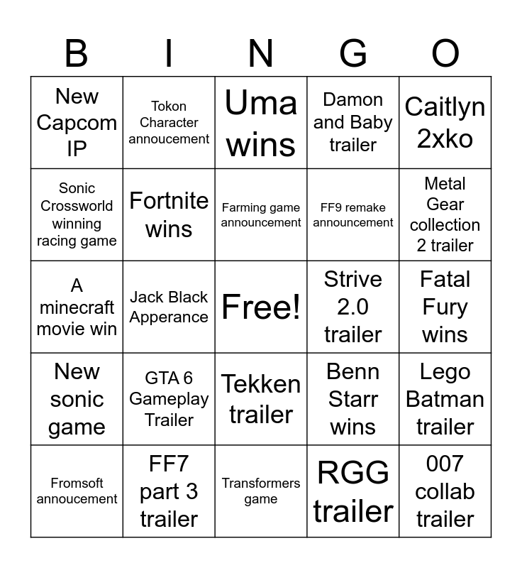 This bingo card has a free space and 24 words: GTA 6 Gameplay Trailer, FF7 part 3 trailer, Farming game announcement, Fromsoft annoucement, Caitlyn 2xko, New Capcom IP, Sonic Crossworld winning racing game, Tokon Character annoucement, Strive 2.0 trailer, Tekken trailer, FF9 remake announcement, A minecraft movie win, Benn Starr wins, Lego Batman trailer, Fortnite wins, RGG trailer, Fatal Fury wins, Uma wins, Metal Gear collection 2 trailer, Jack Black Apperance, 007 collab trailer, New sonic game, Damon and Baby trailer and Transformers game.