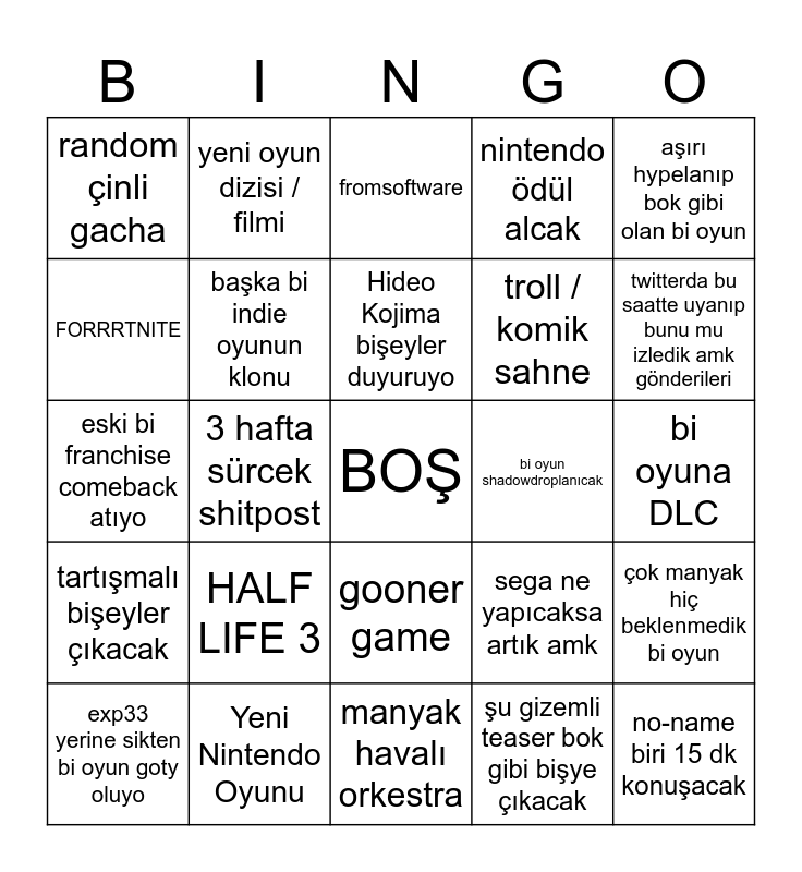 This bingo card has a free space and 24 words: HALF LIFE 3, Yeni Nintendo Oyunu, Hideo Kojima bişeyler duyuruyo, exp33 yerine sikten bi oyun goty oluyo, aşırı hypelanıp bok gibi olan bi oyun, random çinli gacha, FORRRTNITE, yeni oyun dizisi / filmi, bi oyun shadowdroplanıcak, gooner game, troll / komik sahne, eski bi franchise comeback atıyo, sega ne yapıcaksa artık amk, çok manyak hiç beklenmedik bi oyun, başka bi indie oyunun klonu, şu gizemli teaser bok gibi bişye çıkacak, bi oyuna DLC, fromsoftware, twitterda bu saatte uyanıp bunu mu izledik amk gönderileri, 3 hafta sürcek shitpost, no-name biri 15 dk konuşacak, tartışmalı bişeyler çıkacak, nintendo ödül alcak and manyak havalı orkestra.