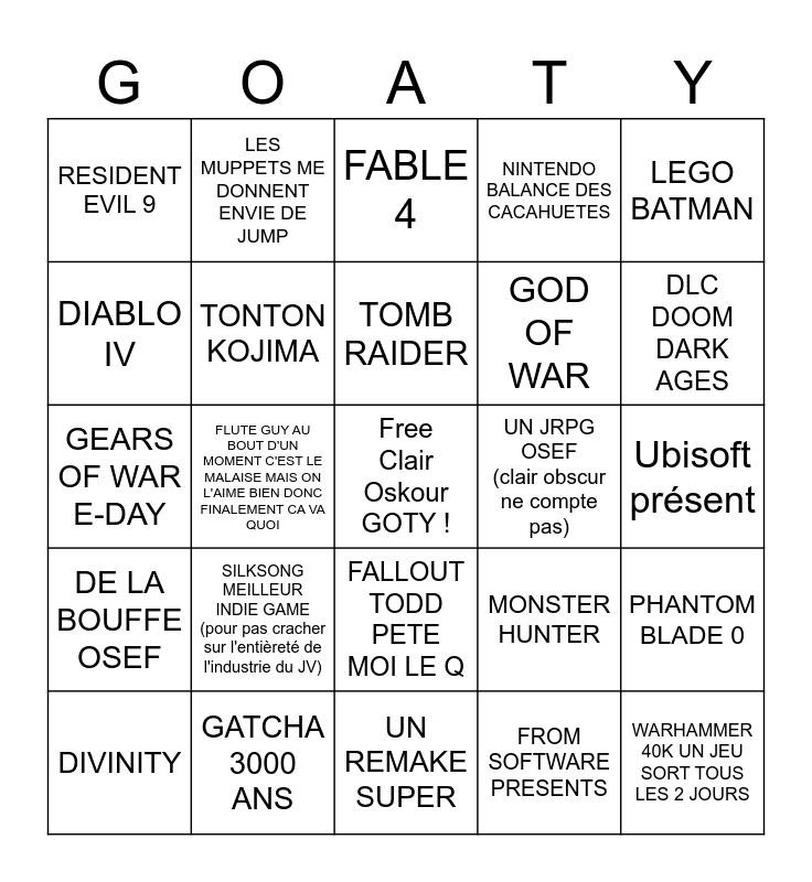 This bingo card has a free space and 24 words: SILKSONG MEILLEUR INDIE GAME (pour pas cracher sur l'entièreté de l'industrie du JV), GATCHA 3000 ANS, TOMB RAIDER, DIVINITY, LEGO BATMAN, RESIDENT EVIL 9, DIABLO IV, LES MUPPETS ME DONNENT ENVIE DE JUMP, UN JRPG OSEF (clair obscur ne compte pas), FALLOUT TODD PETE MOI LE Q, GOD OF WAR, GEARS OF WAR E-DAY, MONSTER HUNTER, PHANTOM BLADE 0, TONTON KOJIMA, FROM SOFTWARE PRESENTS, Ubisoft présent, FABLE 4, DLC DOOM DARK AGES, FLUTE GUY AU BOUT D'UN MOMENT C'EST LE MALAISE MAIS ON L'AIME BIEN DONC FINALEMENT CA VA QUOI, WARHAMMER 40K UN JEU SORT TOUS LES 2 JOURS, DE LA BOUFFE OSEF, NINTENDO BALANCE DES CACAHUETES and UN REMAKE SUPER.
