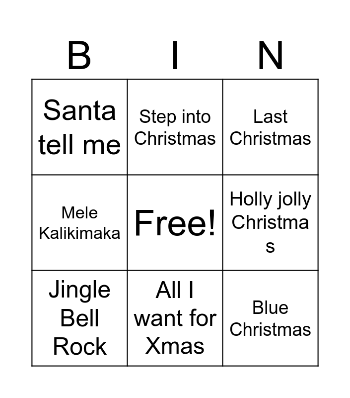 This bingo card has a free space and 11 words: Santa Baby, All I want for Xmas, Blue Christmas, Jingle Bell Rock, Step into Christmas, Last Christmas, Holly jolly Christma s, Driving home for christmas, Mele Kalikimaka, Santa tell me and Christmas wrapping.