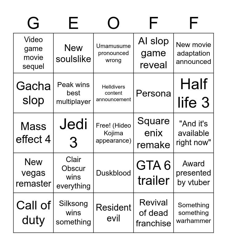 This bingo card has a free space and 24 words: Clair Obscur wins everything, Silksong wins something, Helldivers content announcement, Call of duty, New movie adaptation announced, Video game movie sequel, Gacha slop, New soulslike, Square enix remake, Duskblood, Persona, Mass effect 4, GTA 6 trailer, Award presented by vtuber, Peak wins best multiplayer, Revival of dead franchise, "And it's available right now", Umamusume pronounced wrong, Half life 3, Jedi 3, Something something warhammer, New vegas remaster, AI slop game reveal and Resident evil.