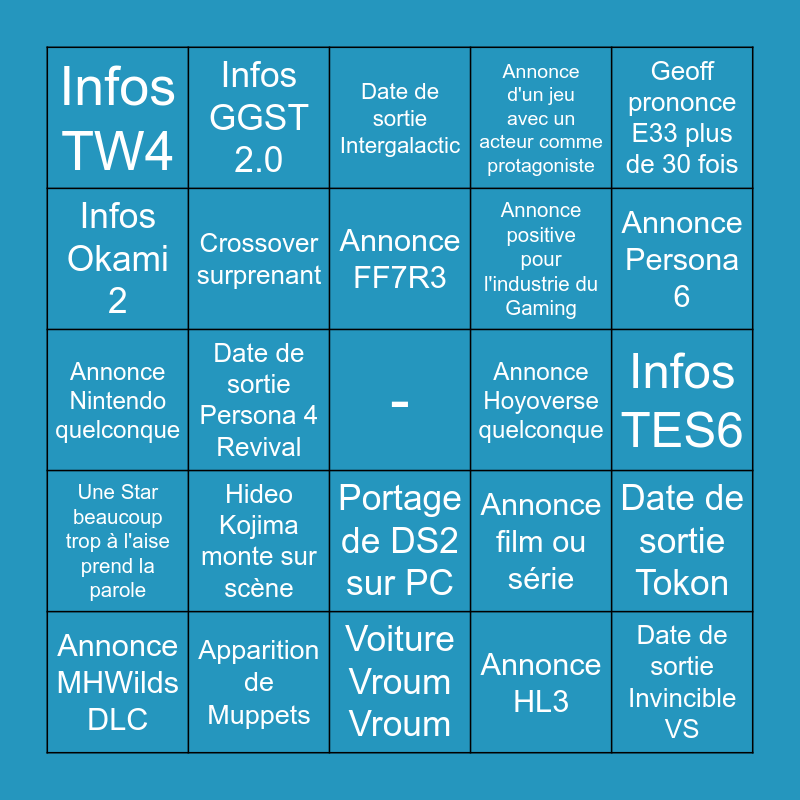 This bingo card has a free space and 24 words: Hideo Kojima monte sur scène, Apparition de Muppets, Annonce FF7R3, Annonce MHWilds DLC, Geoff prononce E33 plus de 30 fois, Infos TW4, Infos Okami 2, Infos GGST 2.0, Annonce Hoyoverse quelconque, Portage de DS2 sur PC, Annonce positive pour l'industrie du Gaming, Annonce Nintendo quelconque, Annonce film ou série, Date de sortie Tokon, Crossover surprenant, Annonce HL3, Infos TES6, Date de sortie Intergalactic, Annonce Persona 6, Date de sortie Persona 4 Revival, Date de sortie Invincible VS, Une Star beaucoup trop à l'aise prend la parole, Annonce d'un jeu avec un acteur comme protagoniste and Voiture Vroum Vroum.
