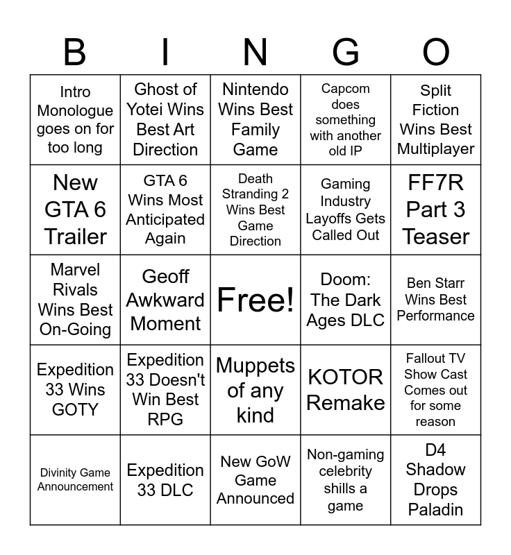 This bingo card has a free space and 24 words: Divinity Game Announcement, Expedition 33 Doesn't Win Best RPG, Death Stranding 2 Wins Best Game Direction, Non-gaming celebrity shills a game, Split Fiction Wins Best Multiplayer, Intro Monologue goes on for too long, Ghost of Yotei Wins Best Art Direction, Nintendo Wins Best Family Game, Doom: The Dark Ages DLC, Ben Starr Wins Best Performance, Marvel Rivals Wins Best On-Going, GTA 6 Wins Most Anticipated Again, KOTOR Remake, Fallout TV Show Cast Comes out for some reason, New GTA 6 Trailer, Expedition 33 DLC, New GoW Game Announced, Capcom does something with another old IP, FF7R Part 3 Teaser, Expedition 33 Wins GOTY, Geoff Awkward Moment, Muppets of any kind, Gaming Industry Layoffs Gets Called Out and D4 Shadow Drops Paladin.