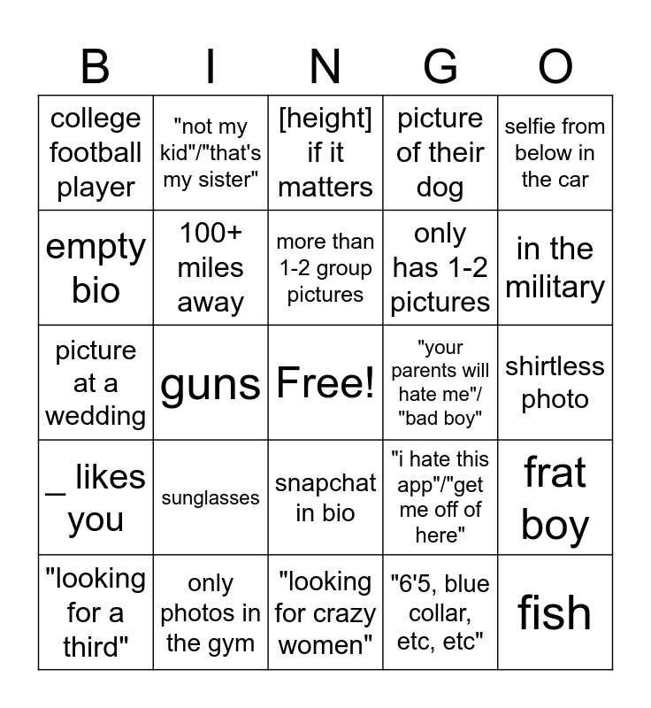 This bingo card has a free space and 30 words: only photos in the gym, dead animal/ hunting, guns, college baseball player, college football player, [height] if it matters, 100+ miles away, snapchat in bio, "your parents will hate me"/ "bad boy", "looking for crazy women", shirtless photo, fish, "6'5, blue collar, etc, etc", "new in town"/"just moved here", in the military, "searching for a wife", "i hate this app"/"get me off of here", _ likes you, sunglasses, selfie from below in the car, picture at a wedding, clearly republican, "not my kid"/"that's my sister", only has 1-2 pictures, empty bio, picture of their dog, frat boy, "looking for a third", more than 1-2 group pictures and a match.