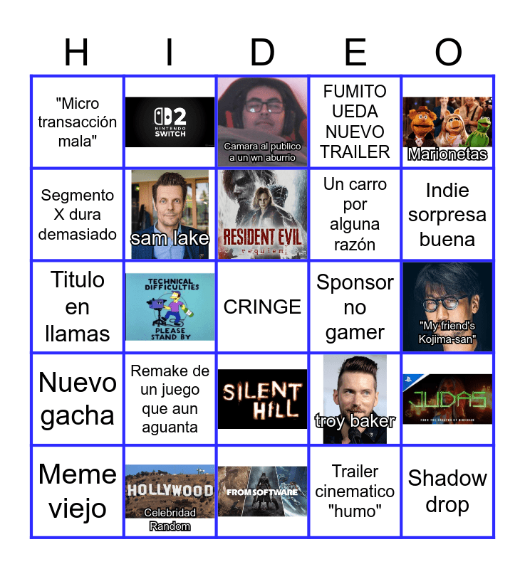 This bingo card has 15 images, a free space and 21 words: Meme viejo, JRPG Remaster 2D/3D, el wn de los instrumentos de viento, "Micro transacción mala", Camara al publico a un wn aburrio, sam lake, Remake de un juego que aun aguanta, Sponsor no gamer, Celebridad Random, "My friend's Kojima-san", Shadow drop, Trailer cinematico "humo", Indie sorpresa buena, Premio fuera de cámara, Nuevo gacha, Marionetas, Titulo en llamas, troy baker, Un carro por alguna razón, Segmento X dura demasiado and FUMITO UEDA NUEVO TRAILER.