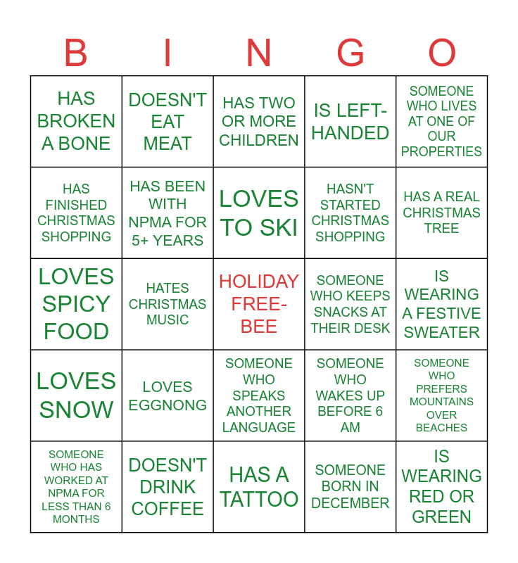 This bingo card has a free space and 24 words: LOVES EGGNONG, DOESN'T DRINK COFFEE, LOVES TO SKI, SOMEONE WHO HAS WORKED AT NPMA FOR LESS THAN 6 MONTHS, SOMEONE WHO LIVES AT ONE OF OUR PROPERTIES, HAS BROKEN A BONE, HAS FINISHED CHRISTMAS SHOPPING, DOESN'T EAT MEAT, SOMEONE WHO KEEPS SNACKS AT THEIR DESK, SOMEONE WHO SPEAKS ANOTHER LANGUAGE, HASN'T STARTED CHRISTMAS SHOPPING, LOVES SPICY FOOD, SOMEONE WHO WAKES UP BEFORE 6 AM, SOMEONE WHO PREFERS MOUNTAINS OVER BEACHES, HAS BEEN WITH NPMA FOR 5+ YEARS, SOMEONE BORN IN DECEMBER, IS WEARING A FESTIVE SWEATER, HAS TWO OR MORE CHILDREN, HAS A REAL CHRISTMAS TREE, HATES CHRISTMAS MUSIC, IS WEARING RED OR GREEN, LOVES SNOW, IS LEFT-HANDED and HAS A TATTOO.