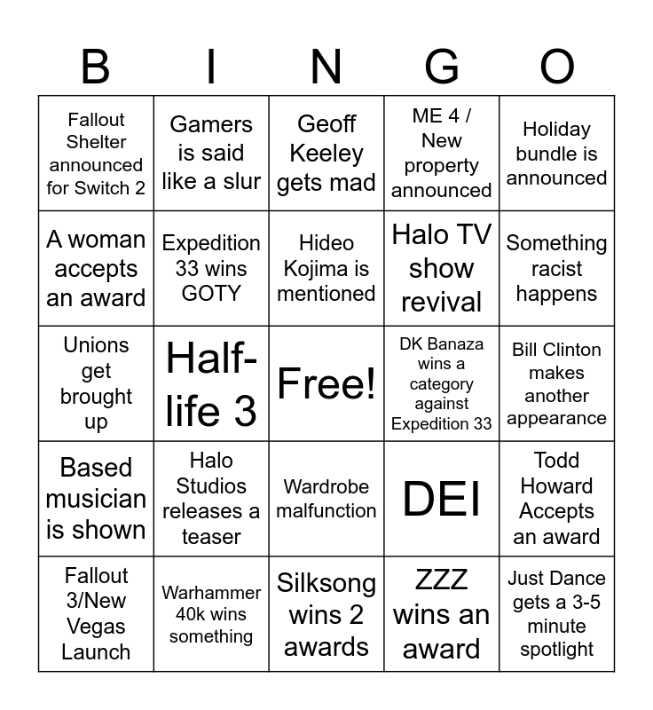 This bingo card has a free space and 29 words: Fallout 3/New Vegas Launch, They talk about Palestine, Half-life 3, 10 minute long speech, Fallout Shelter announced for Switch 2, Geoff Keeley gets mad, Expedition 33 wins GOTY, Halo Studios releases a teaser, DK Banaza wins a category against Expedition 33, Warhammer 40k wins something, Bill Clinton makes another appearance, Just Dance gets a 3-5 minute spotlight, Silksong wins 2 awards, ZZZ wins an award, Something racist happens, Stream cuts out, Wardrobe malfunction, Based musician is shown, Holiday bundle is announced, Unions get brought up, DEI, Expedition 33 doesn’t win GOTY, Halo TV show revival, A woman accepts an award, ME 4 / New property announced, Gamers is said like a slur, Todd Howard Accepts an award, Hideo Kojima is mentioned and “Politics” is mentioned.