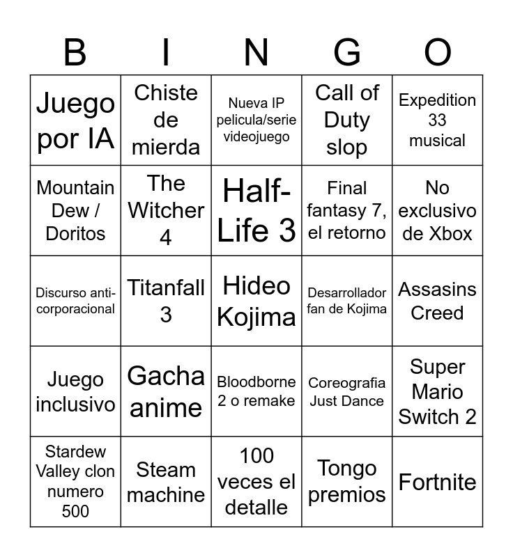 This bingo card has a free space and 24 words: Gacha anime, Steam machine, Half-Life 3, Stardew Valley clon numero 500, Expedition 33 musical, Juego por IA, Mountain Dew / Doritos, Chiste de mierda, Desarrollador fan de Kojima, Bloodborne 2 o remake, Final fantasy 7, el retorno, Discurso anti-corporacional, Coreografia Just Dance, Super Mario Switch 2, The Witcher 4, Tongo premios, Assasins Creed, Nueva IP pelicula/serie videojuego, No exclusivo de Xbox, Titanfall 3, Fortnite, Juego inclusivo, Call of Duty slop and 100 veces el detalle.
