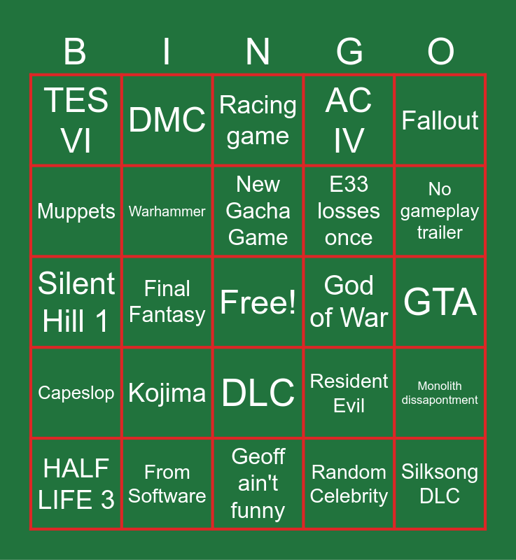 This bingo card has a free space and 24 words: Kojima, From Software, New Gacha Game, HALF LIFE 3, Fallout, TES VI, Muppets, DMC, God of War, DLC, E33 losses once, Silent Hill 1, Resident Evil, Monolith dissapontment, Warhammer, Random Celebrity, GTA, Racing game, No gameplay trailer, Final Fantasy, Silksong DLC, Capeslop, AC IV and Geoff ain't funny.