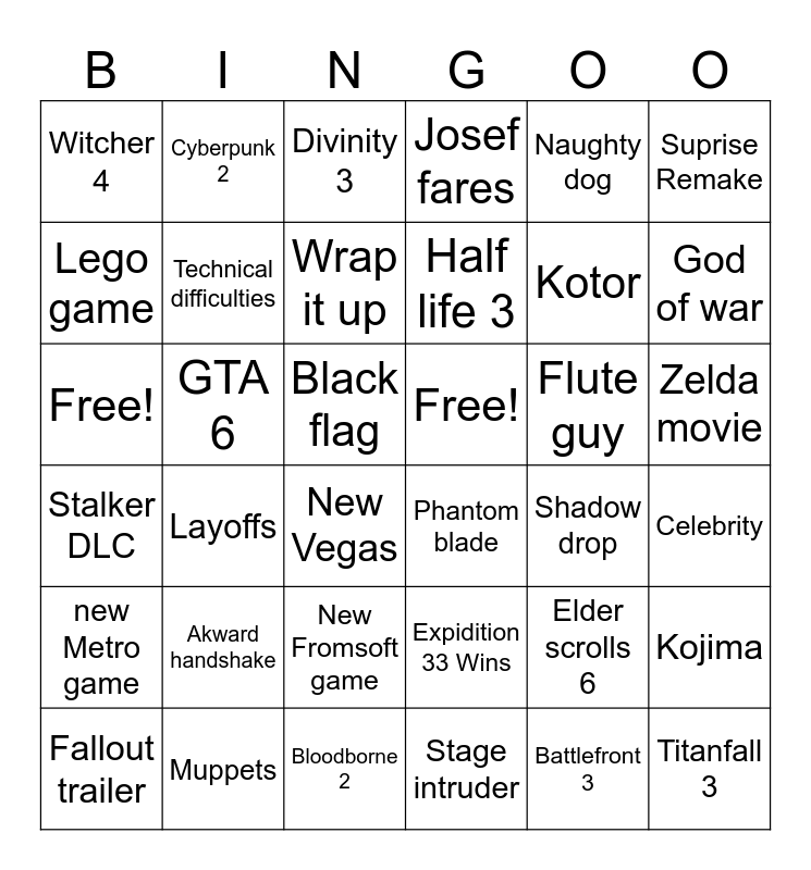 This bingo card has 36 words: Expidition 33 Wins, New Fromsoft game, Stage intruder, Lego game, Stalker DLC, Free!, Technical difficulties, Bloodborne 2, Naughty dog, Elder scrolls 6, God of war, Josef fares, Kojima, GTA 6, Half life 3, Witcher 4, new Metro game, Flute guy, Free!, Divinity 3, Black flag, Layoffs, Phantom blade, New Vegas, Shadow drop, Cyberpunk 2, Kotor, Muppets, Wrap it up, Suprise Remake, Titanfall 3, Fallout trailer, Celebrity, Zelda movie, Akward handshake and Battlefront 3.