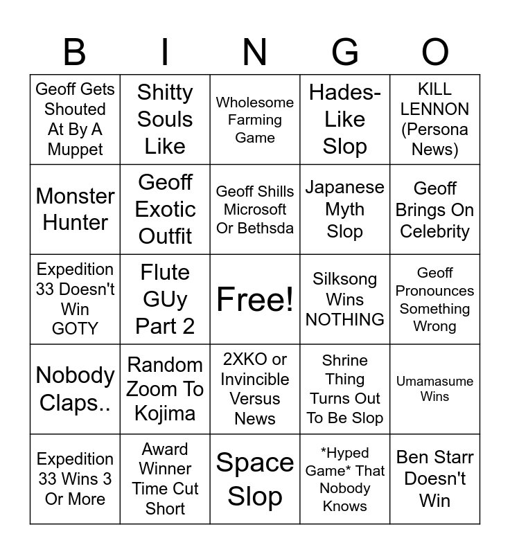 This bingo card has a free space and 24 words: Random Zoom To Kojima, Award Winner Time Cut Short, Geoff Shills Microsoft Or Bethsda, Expedition 33 Wins 3 Or More, KILL LENNON (Persona News), Geoff Gets Shouted At By A Muppet, Monster Hunter, Shitty Souls Like, Silksong Wins NOTHING, 2XKO or Invincible Versus News, Japanese Myth Slop, Expedition 33 Doesn't Win GOTY, Shrine Thing Turns Out To Be Slop, Umamasume Wins, Geoff Exotic Outfit, *Hyped Game* That Nobody Knows, Geoff Pronounces Something Wrong, Wholesome Farming Game, Geoff Brings On Celebrity, Flute GUy Part 2, Ben Starr Doesn't Win, Nobody Claps.., Hades-Like Slop and Space Slop.
