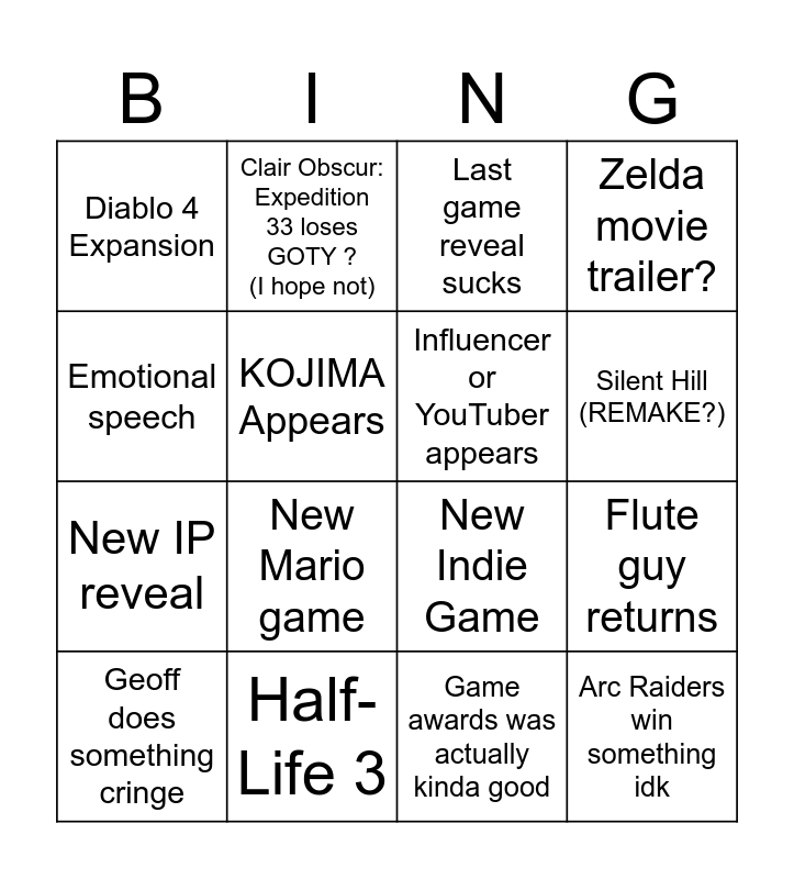 This bingo card has 25 words: Max Payne 1 & 2 Remake (Teaser), BIOSHOCK 4, Silent Hill (REMAKE?), Resident Evil Requiem, Emotional speech, Diablo 4 Expansion, KOJIMA Appears, Clair Obscur: Expedition 33 loses GOTY ? (I hope not), Half-Life 3, Something SEGA, New IP reveal, New Indie Game, Fable New trailer, Someone screams/claps loudly, Influencer or YouTuber appears, FREE, Game awards was actually kinda good, Last game reveal sucks, New Mario game, Flute guy returns, Geoff does something cringe, A developer does/says something cringe, Arc Raiders win something idk, Zelda movie trailer? and Someone interrupts the show.