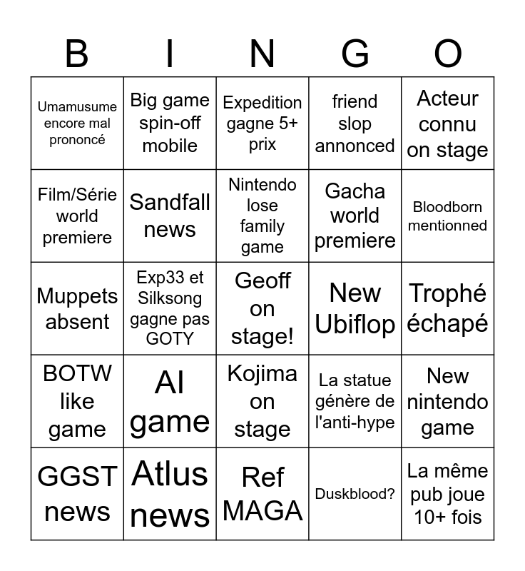 This bingo card has a free space and 24 words: AI game, Atlus news, Nintendo lose family game, GGST news, Acteur connu on stage, Umamusume encore mal prononcé, Film/Série world premiere, Big game spin-off mobile, New Ubiflop, Kojima on stage, Gacha world premiere, Muppets absent, La statue génère de l'anti-hype, New nintendo game, Sandfall news, Duskblood?, Trophé échapé, Expedition gagne 5+ prix, Bloodborn mentionned, Exp33 et Silksong gagne pas GOTY, La même pub joue 10+ fois, BOTW like game, friend slop annonced and Ref MAGA.