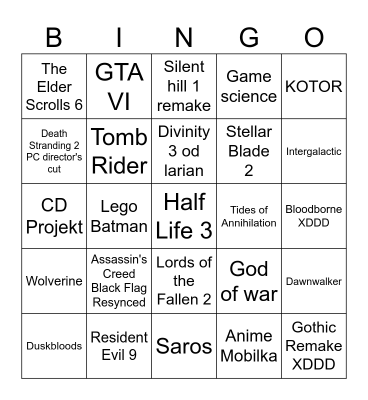 This bingo card has a free space and 24 words: Assassin's Creed Black Flag Resynced, Resident Evil 9, Divinity 3 od larian, Duskbloods, KOTOR, The Elder Scrolls 6, Death Stranding 2 PC director's cut, GTA VI, Tides of Annihilation, Lords of the Fallen 2, Stellar Blade 2, CD Projekt, God of war, Dawnwalker, Tomb Rider, Anime Mobilka, Bloodborne XDDD, Silent hill 1 remake, Intergalactic, Lego Batman, Gothic Remake XDDD, Wolverine, Game science and Saros.