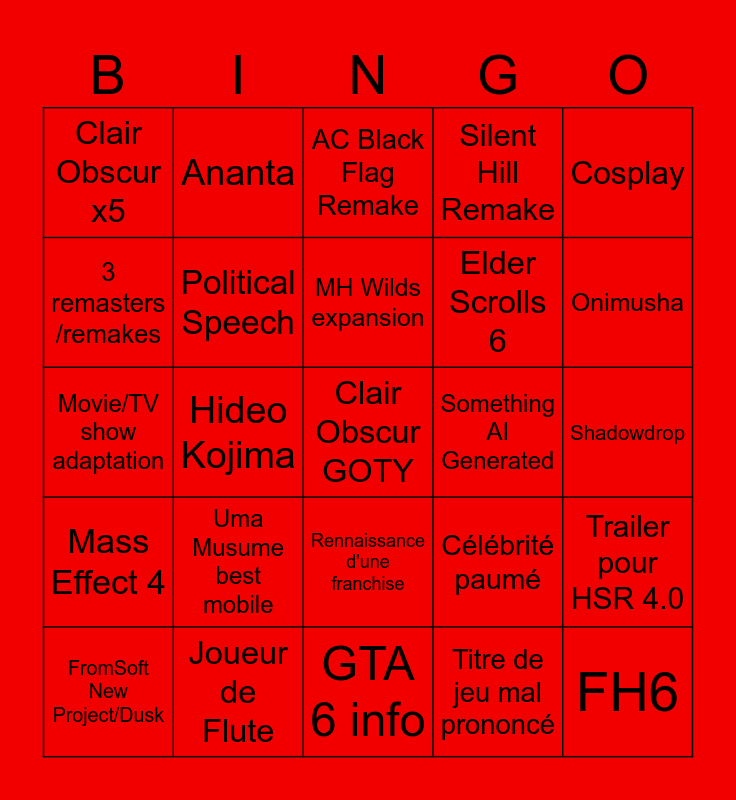 This bingo card has a free space and 29 words: FromSoft New Project/Dusk, Half Life 3, Hideo Kojima, The Witcher 4 Info, Clair Obscur x5, AC Black Flag Remake, Political Speech, Uma Musume best mobile, Something AI Generated, Joueur de Flute, Shadowdrop, FH6, GTA 6 info, Titre de jeu mal prononcé, Onimusha, Persona, Rennaissance d'une franchise, Mass Effect 4, Cosplay, Movie/TV show adaptation, Célébrité paumé, Stranger than Heaven, Elder Scrolls 6, 3 remasters /remakes, Silent Hill Remake, Ananta, Trailer pour HSR 4.0, MH Wilds expansion and CDPR New Project.
