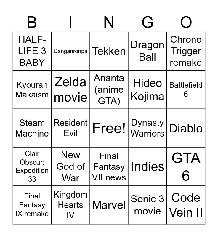 This bingo card has a free space and 24 words: New God of War, Kingdom Hearts IV, Ananta (anime GTA), Final Fantasy IX remake, Chrono Trigger remake, HALF-LIFE 3 BABY, Kyouran Makaism, Danganronpa, Dynasty Warriors, Final Fantasy VII news, Hideo Kojima, Steam Machine, Indies, GTA 6, Zelda movie, Sonic 3 movie, Diablo, Tekken, Battlefield 6, Resident Evil, Code Vein II, Clair Obscur: Expedition 33, Dragon Ball and Marvel.