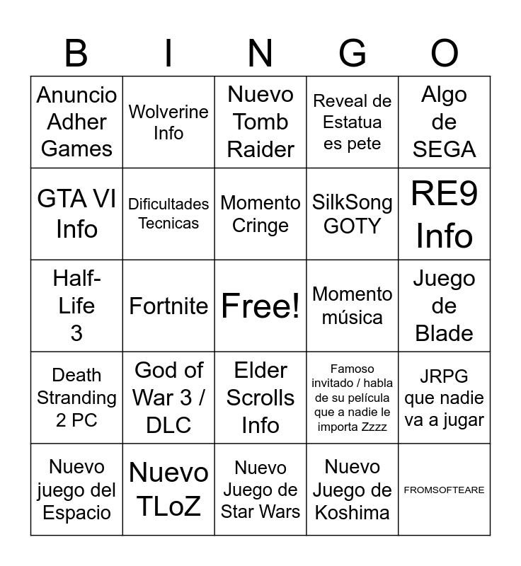 This bingo card has a free space and 24 words: God of War 3 / DLC, Nuevo TLoZ, Momento Cringe, Nuevo juego del Espacio, Algo de SEGA, Anuncio Adher Games, GTA VI Info, Wolverine Info, Momento música, Elder Scrolls Info, SilkSong GOTY, Half-Life 3, Famoso invitado / habla de su película que a nadie le importa Zzzz, JRPG que nadie va a jugar, Dificultades Tecnicas, Nuevo Juego de Koshima, Juego de Blade, Nuevo Tomb Raider, RE9 Info, Fortnite, FROMSOFTEARE, Death Stranding 2 PC, Reveal de Estatua es pete and Nuevo Juego de Star Wars.