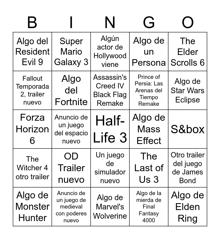 This bingo card has a free space and 24 words: OD Trailer nuevo, Anuncio de un juego de medieval con poderes nuevo, Assassin's Creed IV Black Flag Remake, Algo de Monster Hunter, The Elder Scrolls 6, Algo del Resident Evil 9, Fallout Temporada 2, trailer nuevo, Super Mario Galaxy 3, Algo de Mass Effect, Un juego de simulador nuevo, Prince of Persia: Las Arenas del Tiempo Remake, Forza Horizon 6, The Last of Us 3, Otro trailer del juego de James Bond, Algo del Fortnite, Algo de la mierda de Final Fantasy 4000, S&box, Algún actor de Hollywood viene, Algo de Star Wars Eclipse, Anuncio de un juego del espacio nuevo, Algo de Elden Ring, The Witcher 4 otro trailer, Algo de un Persona and Algo de Marvel's Wolverine.