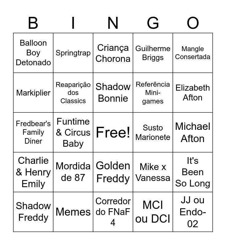 This bingo card has a free space and 24 words: Mordida de 87, Memes, Shadow Bonnie, Shadow Freddy, Mangle Consertada, Balloon Boy Detonado, Markiplier, Springtrap, Susto Marionete, Golden Freddy, Referência Mini-games, Fredbear's Family Diner, Mike x Vanessa, It's Been So Long, Reaparição dos Classics, MCI ou DCI, Michael Afton, Criança Chorona, Elizabeth Afton, Funtime & Circus Baby, JJ ou Endo-02, Charlie & Henry Emily, Guilherme Briggs and Corredor do FNaF 4.