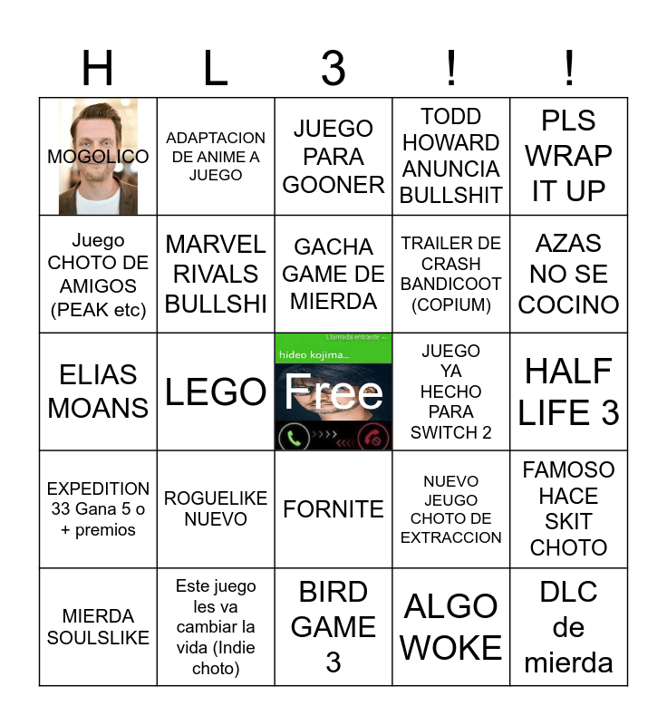 This bingo card has 1 images, a free space and 24 words: ROGUELIKE NUEVO, Este juego les va cambiar la vida (Indie choto), GACHA GAME DE MIERDA, MIERDA SOULSLIKE, PLS WRAP IT UP, MOGOLICO, Juego CHOTO DE AMIGOS (PEAK etc), ADAPTACION DE ANIME A JUEGO, JUEGO YA HECHO PARA SWITCH 2, FORNITE, TRAILER DE CRASH BANDICOOT (COPIUM), ELIAS MOANS, NUEVO JEUGO CHOTO DE EXTRACCION, FAMOSO HACE SKIT CHOTO, MARVEL RIVALS BULLSHI, ALGO WOKE, HALF LIFE 3, JUEGO PARA GOONER, AZAS NO SE COCINO, LEGO, DLC de mierda, EXPEDITION 33 Gana 5 o + premios, TODD HOWARD ANUNCIA BULLSHIT and BIRD GAME 3.