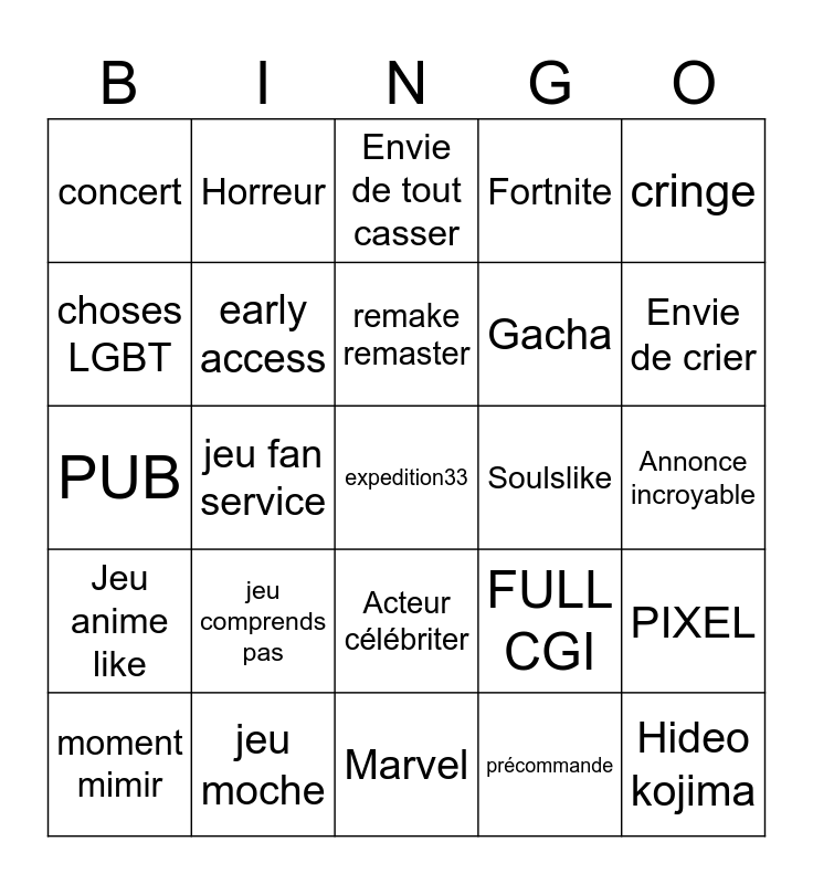 This bingo card has a free space and 24 words: jeu comprends pas, jeu moche, remake remaster, moment mimir, cringe, concert, choses LGBT, Horreur, Soulslike, Acteur célébriter, Gacha, PUB, FULL CGI, PIXEL, early access, précommande, Annonce incroyable, Envie de tout casser, Envie de crier, jeu fan service, Hideo kojima, Jeu anime like, Fortnite and Marvel.
