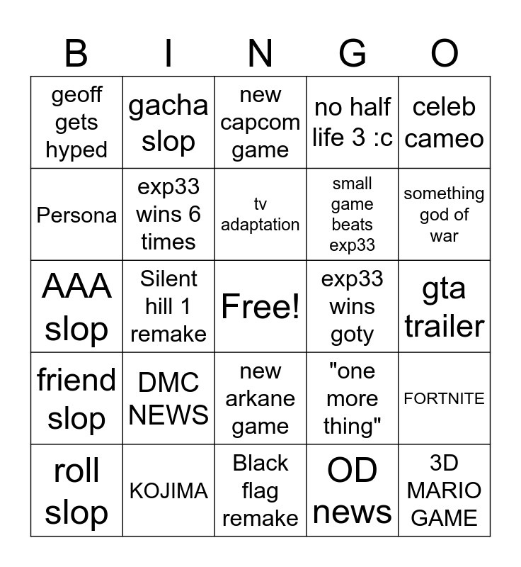 This bingo card has a free space and 24 words: DMC NEWS, KOJIMA, tv adaptation, roll slop, celeb cameo, geoff gets hyped, Persona, gacha slop, exp33 wins goty, new arkane game, small game beats exp33, AAA slop, "one more thing", FORTNITE, exp33 wins 6 times, OD news, gta trailer, new capcom game, something god of war, Silent hill 1 remake, 3D MARIO GAME, friend slop, no half life 3 :c and Black flag remake.