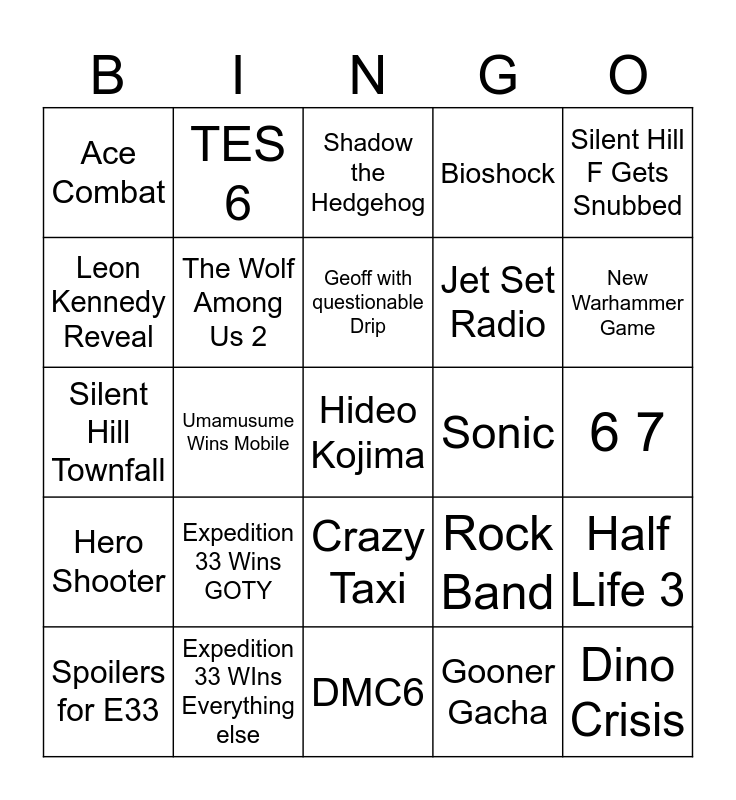 This bingo card has a free space and 24 words: Expedition 33 Wins GOTY, Expedition 33 WIns Everything else, Geoff with questionable Drip, Spoilers for E33, Silent Hill F Gets Snubbed, Ace Combat, Leon Kennedy Reveal, TES 6, Sonic, Crazy Taxi, Jet Set Radio, Silent Hill Townfall, Rock Band, Half Life 3, The Wolf Among Us 2, Gooner Gacha, 6 7, Shadow the Hedgehog, New Warhammer Game, Umamusume Wins Mobile, Dino Crisis, Hero Shooter, Bioshock and DMC6.