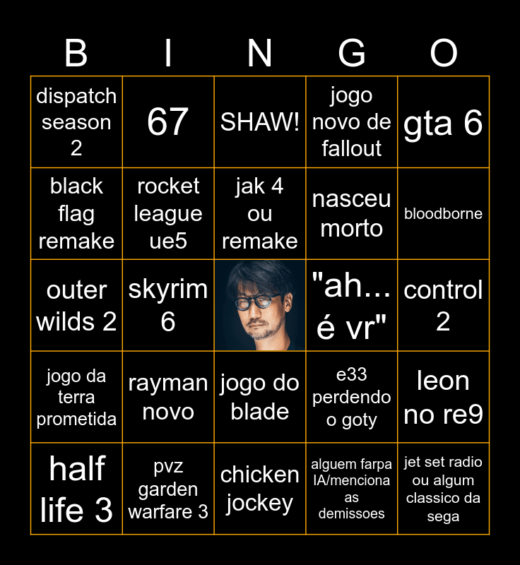 This bingo card has a free space and 24 words: rayman novo, pvz garden warfare 3, jak 4 ou remake, half life 3, gta 6, dispatch season 2, black flag remake, 67, "ah... é vr", jogo do blade, nasceu morto, outer wilds 2, e33 perdendo o goty, leon no re9, rocket league ue5, alguem farpa IA/menciona as demissoes, control 2, SHAW!, bloodborne, skyrim 6, jet set radio ou algum classico da sega, jogo da terra prometida, jogo novo de fallout and chicken jockey.