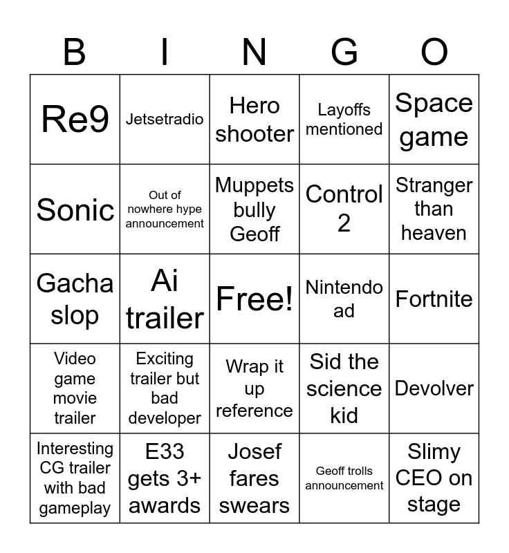 This bingo card has a free space and 24 words: Exciting trailer but bad developer, E33 gets 3+ awards, Muppets bully Geoff, Interesting CG trailer with bad gameplay, Space game, Re9, Sonic, Jetsetradio, Nintendo ad, Wrap it up reference, Control 2, Gacha slop, Sid the science kid, Devolver, Out of nowhere hype announcement, Geoff trolls announcement, Fortnite, Hero shooter, Stranger than heaven, Ai trailer, Slimy CEO on stage, Video game movie trailer, Layoffs mentioned and Josef fares swears.