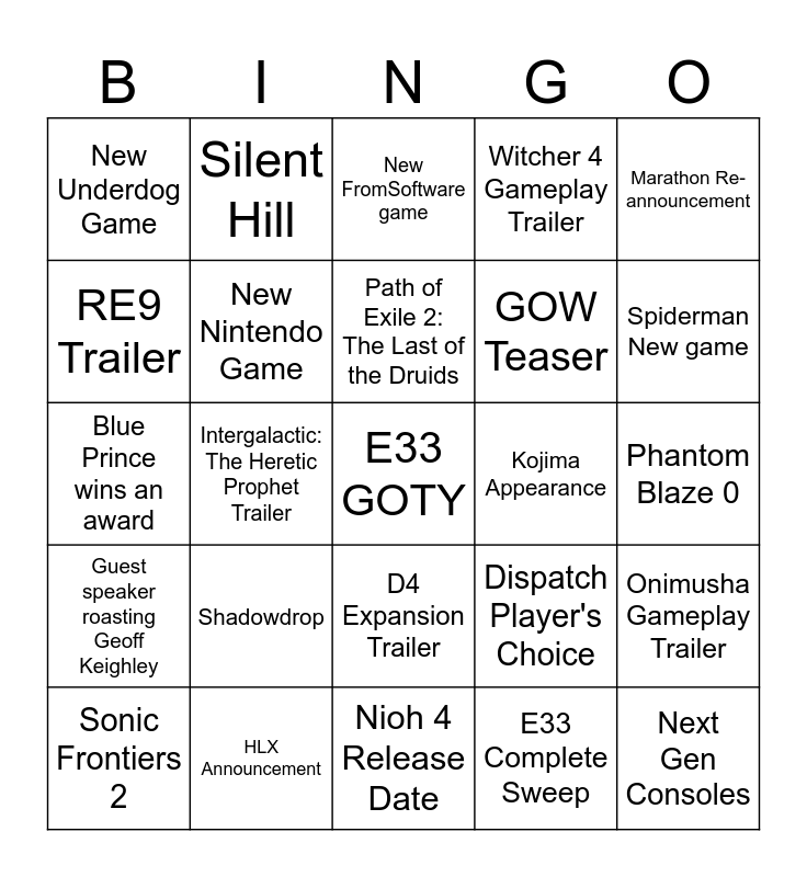 This bingo card has a free space and 24 words: Shadowdrop, HLX Announcement, Path of Exile 2: The Last of the Druids, Sonic Frontiers 2, Marathon Re-announcement, New Underdog Game, RE9 Trailer, Silent Hill, Kojima Appearance, D4 Expansion Trailer, GOW Teaser, Blue Prince wins an award, Dispatch Player's Choice, Onimusha Gameplay Trailer, New Nintendo Game, E33 Complete Sweep, Phantom Blaze 0, New FromSoftware game, Spiderman New game, Intergalactic: The Heretic Prophet Trailer, Next Gen Consoles, Guest speaker roasting Geoff Keighley, Witcher 4 Gameplay Trailer and Nioh 4 Release Date.