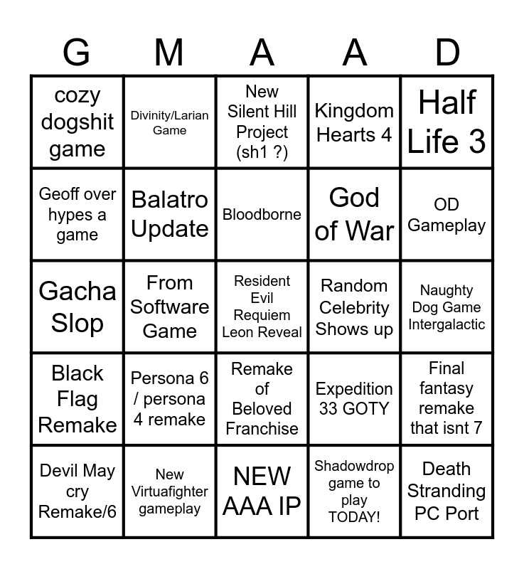 This bingo card has a free space and 24 words: Persona 6 / persona 4 remake, New Virtuafighter gameplay, Bloodborne, Devil May cry Remake/6, Half Life 3, cozy dogshit game, Geoff over hypes a game, Divinity/Larian Game, Random Celebrity Shows up, Remake of Beloved Franchise, God of War, Gacha Slop, Expedition 33 GOTY, Final fantasy remake that isnt 7, Balatro Update, Shadowdrop game to play TODAY!, Naughty Dog Game Intergalactic, New Silent Hill Project (sh1 ?), OD Gameplay, From Software Game, Death Stranding PC Port, Black Flag Remake, Kingdom Hearts 4 and NEW AAA IP.