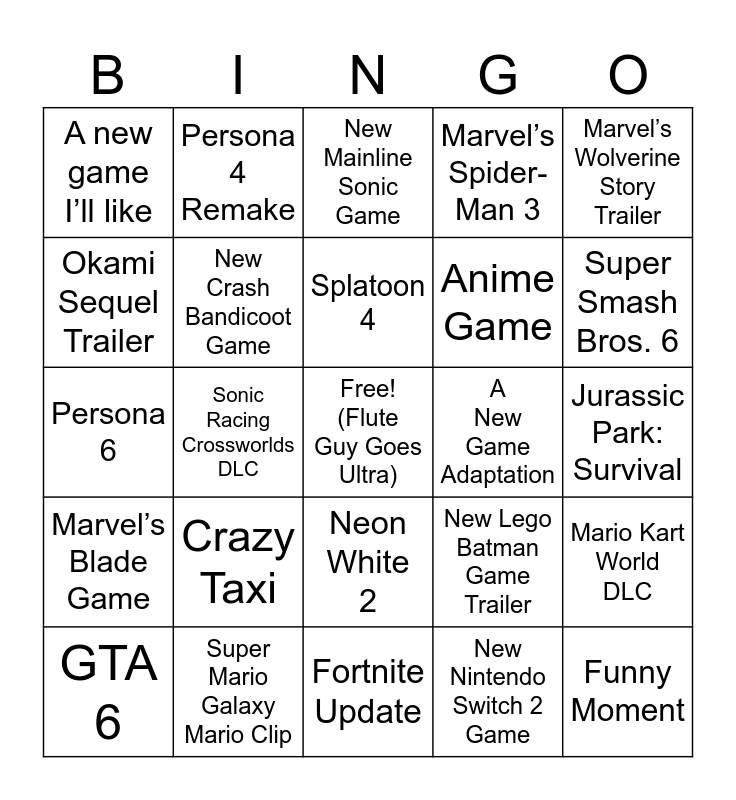 This bingo card has a free space and 24 words: Crazy Taxi, Super Mario Galaxy Mario Clip, Splatoon 4, GTA 6, Marvel’s Wolverine Story Trailer, A new game I’ll like, Okami Sequel Trailer, Persona 4 Remake, A New Game Adaptation, Neon White 2, Anime Game, Persona 6, New Lego Batman Game Trailer, Mario Kart World DLC, New Crash Bandicoot Game, New Nintendo Switch 2 Game, Jurassic Park: Survival, New Mainline Sonic Game, Super Smash Bros. 6, Sonic Racing Crossworlds DLC, Funny Moment, Marvel’s Blade Game, Marvel’s Spider-Man 3 and Fortnite Update.