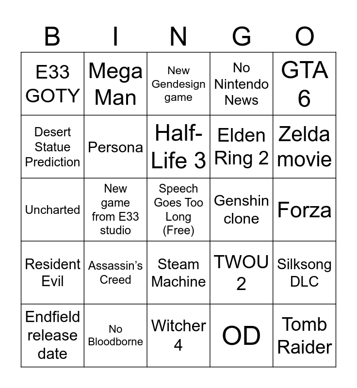 This bingo card has a free space and 35 words: FF17, AA7, Divinity 3, Persona, Steam Machine, No Nintendo News, Desert Statue Prediction, AA Port/Remaster, Half-Life 3, Telltale, Uncharted, GTA 6, Sonic, Bloodborne Remaster, E33 GOTY, Genshin clone, OD, New game from E33 studio, Resident Evil, Tomb Raider, TWOU 2, Endfield release date, Silksong DLC, No Bloodborne, New Gendesign game, Zelda movie, Sonic 4 news, Okami, Elden Ring 2, Forza, Keanu Reeves, Witcher 4, Assassin’s Creed, Mega Man and FF7 Part 3.