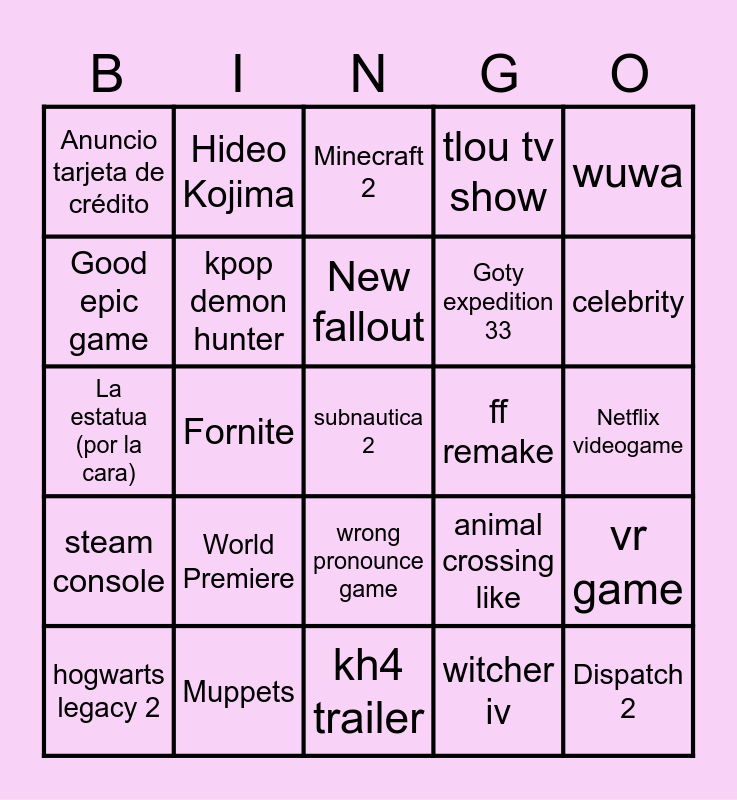 This bingo card has a free space and 24 words: World Premiere, Muppets, New fallout, hogwarts legacy 2, wuwa, Anuncio tarjeta de crédito, Good epic game, Hideo Kojima, ff remake, wrong pronounce game, Goty expedition 33, La estatua (por la cara), animal crossing like, vr game, kpop demon hunter, witcher iv, Netflix videogame, Minecraft 2, celebrity, Fornite, Dispatch 2, steam console, tlou tv show and kh4 trailer.
