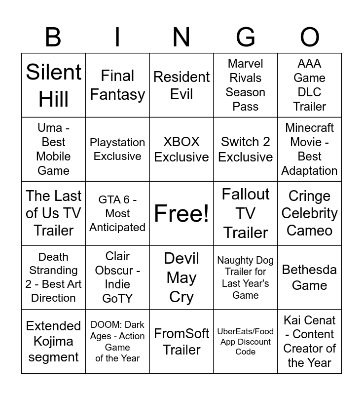 This bingo card has a free space and 25 words: Clair Obscur - Indie GoTY, FromSoft Trailer, XBOX Exclusive, Extended Kojima segment, AAA Game DLC Trailer, Silent Hill, Uma - Best Mobile Game, Final Fantasy, Fallout TV Trailer, Devil May Cry, Switch 2 Exclusive, The Last of Us TV Trailer, Naughty Dog Trailer for Last Year's Game, Bethesda Game, Playstation Exclusive, HALF LIFE 3 HOPIUM, Cringe Celebrity Cameo, Resident Evil, Minecraft Movie - Best Adaptation, GTA 6 - Most Anticipated, Kai Cenat - Content Creator of the Year, DOOM: Dark Ages - Action Game of the Year, Death Stranding 2 - Best Art Direction, Marvel Rivals Season Pass and UberEats/Food App Discount Code.