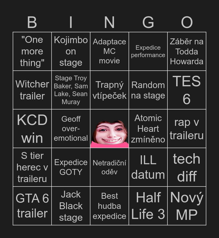 This bingo card has a free space and 24 words: Expedice GOTY, Jack Black stage, Trapný vtípeček, GTA 6 trailer, Záběr na Todda Howarda, "One more thing", Witcher trailer, Kojimbo on stage, Atomic Heart zmíněno, Netradiční oděv, Random na stage, KCD win, ILL datum, tech diff, Stage Troy Baker, Sam Lake, Sean Muray, Half Life 3, rap v traileru, Adaptace MC movie, TES 6, Geoff over- emotional, Nový MP, S tier herec v traileru, Expedice performance and Best hudba expedice.