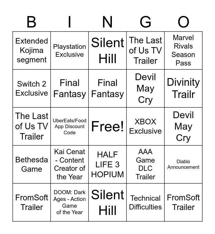 This bingo card has a free space and 56 words: Clair Obscur - Game of the Year, FromSoft Trailer, XBOX Exclusive, Extended Kojima segment, Silent Hill, Uma - Best Mobile Game, Final Fantasy, Fallout TV Trailer, Devil May Cry, Switch 2 Exclusive, The Last of Us TV Trailer, Naughty Dog Trailer for Last Year's Game, Bethesda Game, Playstation Exclusive, DOOM: Dark Ages - Action Game of the Year, Death Stranding 2 - Best Art Direction, Marvel Rivals Season Pass, UberEats/Food App Discount Code, Clair Obscur - Indie GoTY, FromSoft Trailer, XBOX Exclusive, Extended Kojima segment, AAA Game DLC Trailer, Silent Hill, Uma - Best Mobile Game, Final Fantasy, Geoff Keighley cries, Flute Guy Circlejerk, Divinity Trailr, Farming Game, WORLD PREMIERE, Okami 2, GTA 6, Fallout TV Trailer, Devil May Cry, Switch 2 Exclusive, The Last of Us TV Trailer, Naughty Dog Trailer for Last Year's Game, Bethesda Game, Playstation Exclusive, HALF LIFE 3 HOPIUM, Cringe Celebrity Cameo, Resident Evil, Minecraft Movie - Best Adaptation, GTA 6 - Most Anticipated, Kai Cenat - Content Creator of the Year, DOOM: Dark Ages - Action Game of the Year, Death Stranding 2 - Best Art Direction, Marvel Rivals Season Pass, UberEats/Food App Discount Code, Technical Difficulties, Statler and Waldorf insult Geoff, Crowd Boos an Announcement, Geoff talks about how great the industry is, Diablo Announcement and Divinity Franchise Announcement.