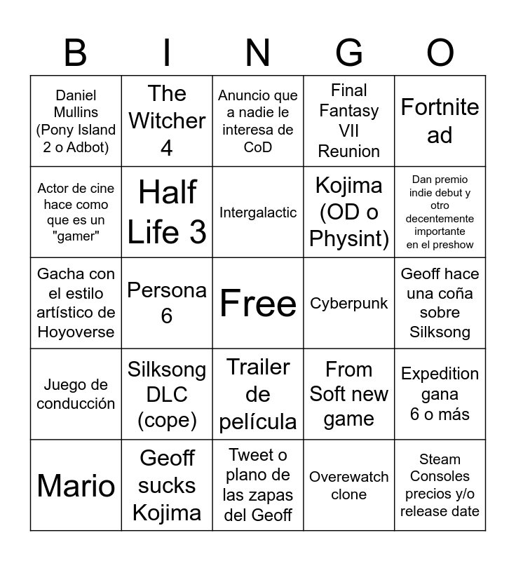 This bingo card has a free space and 24 words: Silksong DLC (cope), Geoff sucks Kojima, Intergalactic, Mario, Fortnite ad, Daniel Mullins (Pony Island 2 o Adbot), Actor de cine hace como que es un "gamer", The Witcher 4, Cyberpunk, Trailer de película, Kojima (OD o Physint), Gacha con el estilo artístico de Hoyoverse, From Soft new game, Expedition gana 6 o más, Half Life 3, Overewatch clone, Geoff hace una coña sobre Silksong, Anuncio que a nadie le interesa de CoD, Dan premio indie debut y otro decentemente importante en el preshow, Persona 6, Steam Consoles precios y/o release date, Juego de conducción, Final Fantasy VII Reunion and Tweet o plano de las zapas del Geoff.