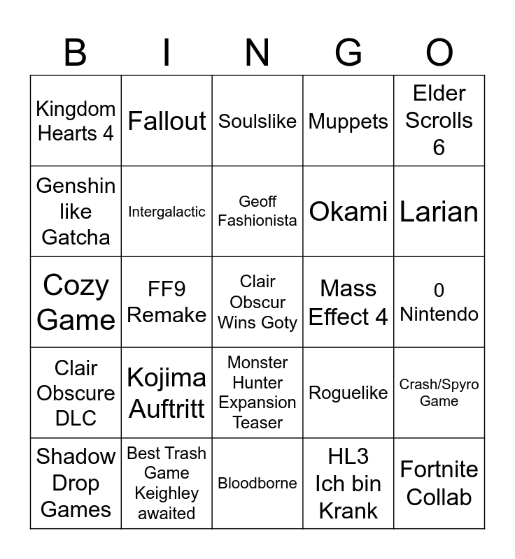 This bingo card has a free space and 24 words: Kojima Auftritt, Best Trash Game Keighley awaited, Geoff Fashionista, Shadow Drop Games, Elder Scrolls 6, Kingdom Hearts 4, Genshin like Gatcha, Fallout, Mass Effect 4, Monster Hunter Expansion Teaser, Okami, Cozy Game, Roguelike, Crash/Spyro Game, Intergalactic, HL3 Ich bin Krank, 0 Nintendo, Soulslike, Larian, FF9 Remake, Fortnite Collab, Clair Obscure DLC, Muppets and Bloodborne.