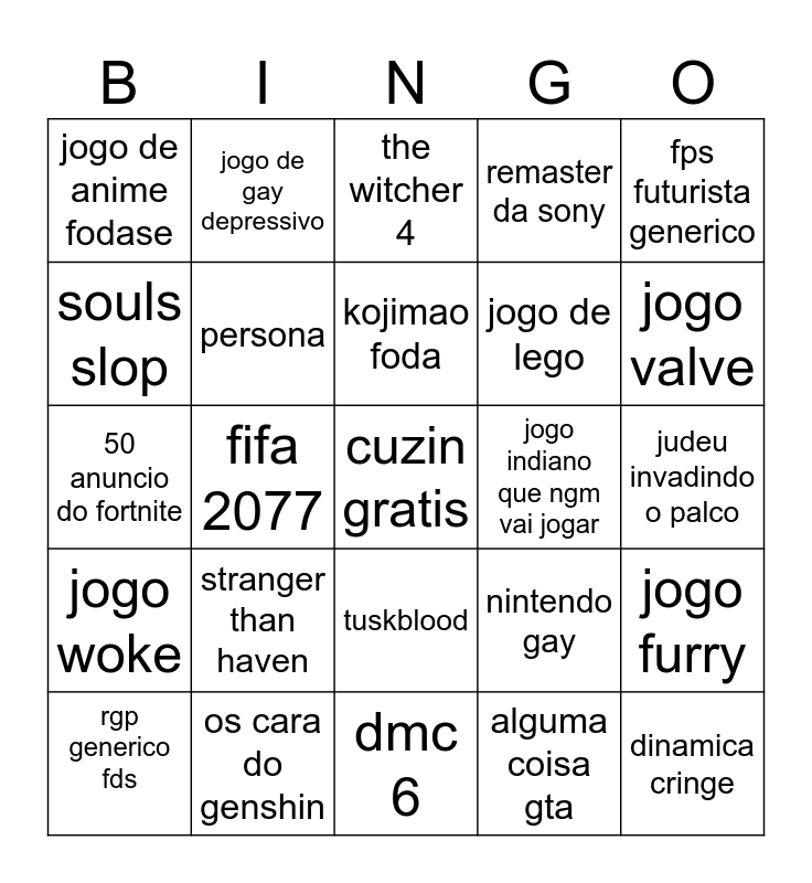 This bingo card has a free space and 24 words: stranger than haven, os cara do genshin, kojimao foda, rgp generico fds, fps futurista generico, jogo de anime fodase, souls slop, jogo de gay depressivo, jogo indiano que ngm vai jogar, tuskblood, jogo de lego, 50 anuncio do fortnite, nintendo gay, jogo furry, persona, alguma coisa gta, judeu invadindo o palco, the witcher 4, jogo valve, fifa 2077, dinamica cringe, jogo woke, remaster da sony and dmc 6.