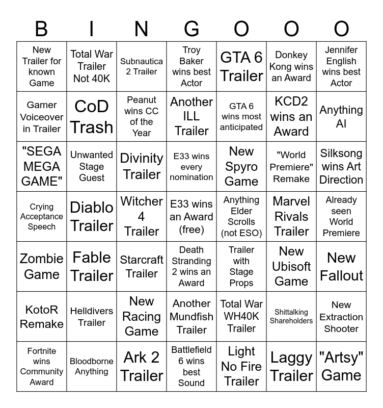 This bingo card has a free space and 48 words: Total War WH40K Trailer, KCD2 wins an Award, Battlefield 6 wins best Sound, Diablo Trailer, Divinity Trailer, Already seen World Premiere, Total War Trailer Not 40K, Bloodborne Anything, Donkey Kong wins an Award, Death Stranding 2 wins an Award, Jennifer English wins best Actor, Troy Baker wins best Actor, "World Premiere" Remake, New Spyro Game, KotoR Remake, Marvel Rivals Trailer, Gamer Voiceover in Trailer, Anything AI, Shittalking Shareholders, GTA 6 Trailer, GTA 6 wins most anticipated, Witcher 4 Trailer, New Trailer for known Game, CoD Trash, New Extraction Shooter, Peanut wins CC of the Year, Silksong wins Art Direction, Fortnite wins Community Award, E33 wins every nomination, Unwanted Stage Guest, Laggy Trailer, Anything Elder Scrolls (not ESO), New Fallout, Helldivers Trailer, Crying Acceptance Speech, Trailer with Stage Props, New Ubisoft Game, "SEGA MEGA GAME", Starcraft Trailer, New Racing Game, Zombie Game, "Artsy" Game, Subnautica 2 Trailer, Ark 2 Trailer, Another ILL Trailer, Another Mundfish Trailer, Fable Trailer and Light No Fire Trailer.