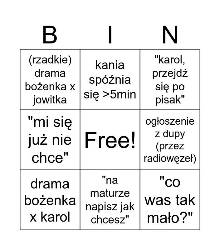This bingo card has a free space and 9 words: drama bożenka x karol, "karol, przejdź się po pisak", kania spóźnia się >5min, "mi się już nie chce", (rzadkie) drama bożenka x jowitka, ogłoszenie z dupy (przez radiowęzeł), "co was tak mało?", "żenua" "szapopa" and "na maturze napisz jak chcesz".